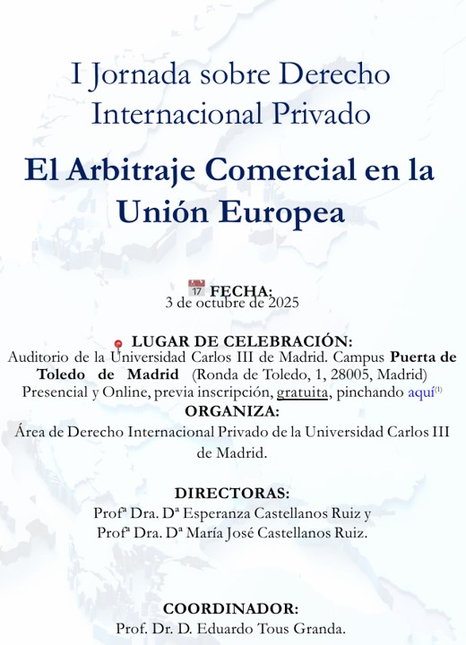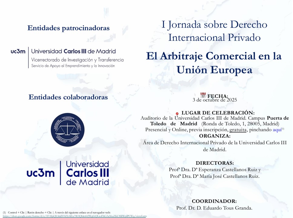 El Campus de Puerta de Toledo de la Universidad Carlos III de Madrid acogió la I Jornada de Derecho Internacional Privado sobre “El Arbitraje Comercial en la Unión Europea”, un encuentro académico y profesional que reunió a destacados juristas, académicos y expertos para reflexionar sobre los principales retos del arbitraje internacional en el contexto europeo actual.