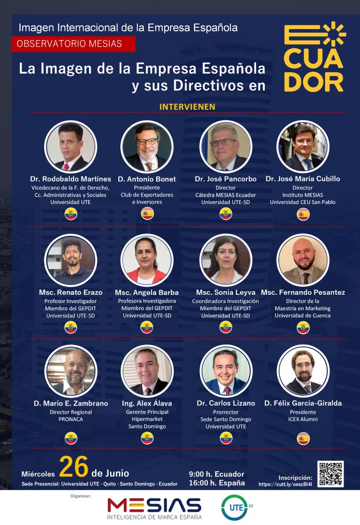 Las empresas españolas gozan de una sólida imagen entre los jóvenes universitarios en Ecuador. Las perciben como compañías reconocidas, tecnológicamente avanzadas, bien gestionadas y con elevada reputación. Así lo revela el informe La Imagen de las Empresas Españolas y sus Directivos en Ecuador 2024, del Observatorio MESIAS, que destaca además su contribución al desarrollo económico del país, la creación de empleo estable y de calidad y su papel en la modernización, la innovación y la mejora del bienestar social.