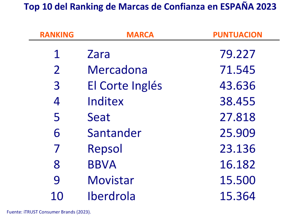 ZARA, con 79.227 puntos, lidera el ranking de ‘marcas de confianza’ iTRUST Consumer Brands en España, elaborado por iTRUST CBI y el Instituto MESIAS MERCADONA y El Corte Inglés ocupan la segunda y tercera posición tras la marca gallega ZARA ha sido distinguida con el reconocimiento ‘Marca de Confianza del Año 2023’ de iTRUST Consumer…