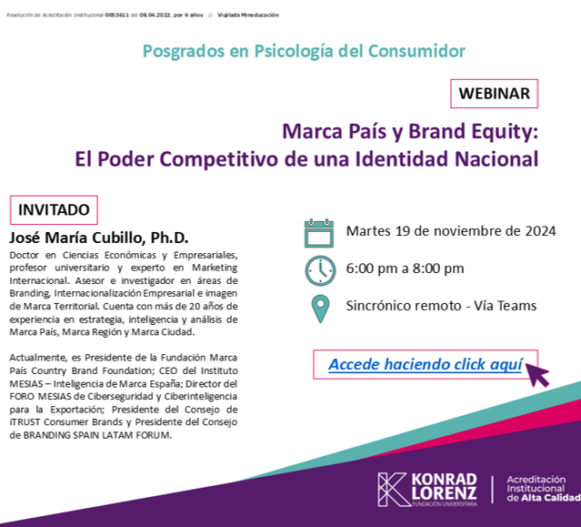 El Instituto MESIAS, a través de su director, el Dr. José María Cubillo, ha participado en una sesión académica con estudiantes de los programas de posgrado en Psicología del Consumidor de la Fundación Universitaria Konrad Lorenz de Colombia, acercando a los futuros especialistas en comportamiento del consumidor a la realidad estratégica de la Marca País…